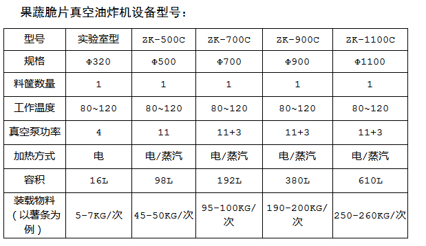 真空油炸是在低温(80~120℃)对食品进行油炸、脱水,可以有效地减少高温对食品营养成份的破坏真空油炸脱油有特殊效果。目前主要应用于:①水果类:苹果、猕猴桃、木葡萄、柿子、草莓、葡萄、桃、梨等;②蔬菜类:西红柿、红薯、土豆、四季豆、香菇、蘑菇、大蒜、胡萝卜、青椒、南瓜、洋葱等;③干果类:大枣、花生等;④水产品及畜禽肉等。